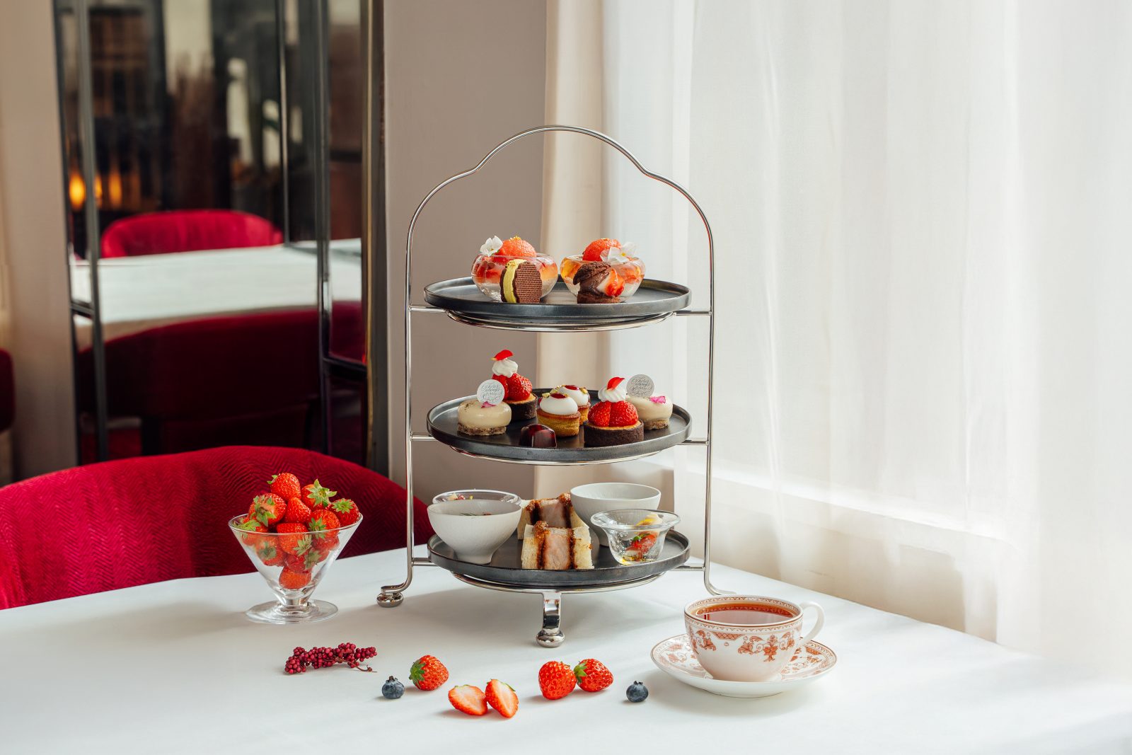 苺の瑞々しさとショコラの芳醇なコクを、段ごとに表情を変えて楽しむアフタヌーンティー。